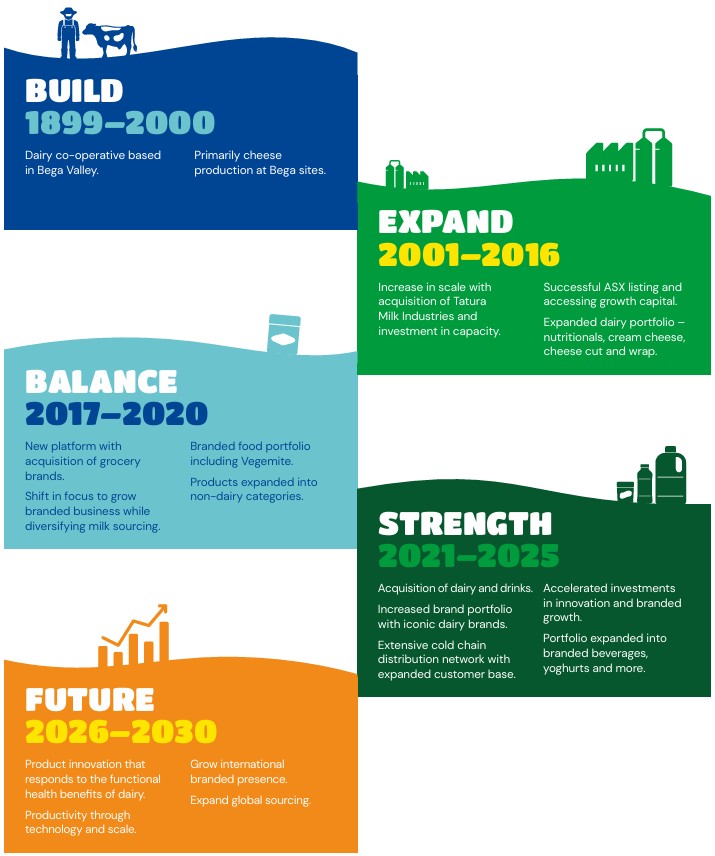 Careers Current Opportunities Join Our Talent Community We are the Bega Group, come and join us at ‘The Great Australian Food Company’ Since 1899 we have been proudly Australian owned. We are an Australian business founded at the Farm Gate. From humble beginnings as a Bega Valley Co-op, to a top 200 ASX listed organisation with great ambitions. In 2001 we transformed from a dairy co-operative with a strong regional cheese brand into a diversified branded food and beverage business. With our heart still grounded in our home in the Bega Valley, the Bega Group is now a truly national business but with a local mindset. We act small but sure do think big and are now made up of thousands of visionary leaders and change makers from all corners of our great country. We have strong relationships directly with farmers and suppliers, that allows us to offer consumers brands that champion sustainability and help meet our shared commitments to building a better future for the communities in which we operate. We are an integrated producer of packaged food products and ingredients enjoyed in over 40 countries and on which millions of Australians rely. We operate across two business segments:Branded – consumer and foodservice products sold through grocery, route, foodservice, petrol and convenience channels. Bulk – nutritional powders and dairy ingredients sold primarily to food manufacturers. Our portfolio of brands can be found across eight major food categories, with many of our brands being market leaders and household names trusted by generations of consumers. The Bega Group is home to many trusted and wholesome food brands that are enjoyed in Australia and all around the world. Our growth story of becoming a successful ASX listed company with a turnover in excess of $3 billion is made possible by our values and outward-looking perspective. We have approximately 3,900 passionate people, working across 19 manufacturing sites and corporate offices in Australia and Internationally who are helping us achieve our vision to become The Great Australian Food Company. To achieve this vision, we focus on creating great food, inspiring great people, having great aspirations and working for the greater good. We run the largest cold chain network in Australia, which allows us to service our customers across Australia and beyond. Our customer service and sales team members work across our sites and on the road to assist customers from supermarkets and convenience outlets through the schools, hospitals and the local milk bar. Our passion for the customer underpins everything we do. Whether it’s your favourite spreads like VEGEMITE and Bega Peanut Butter on toast, a dash of Dairy Farmers milk in your morning coffee, a Big M or Dare Iced Coffee on the go or a Zooper Dooper on a hot day – you’ve probably grown up enjoying the iconic products we proudly manufacture every day by the Bega Group. Our Culture At the Bega Group we believe in creating an inclusive culture, embracing diversity, equity and treating people with respect. The Bega Group seeks to create a culture of care that supports and empowers team members and their families. “It is a great company that delivers what it promises, cares for its people, invests in development, and allows for lifelong careers.” Ben Hennessey – State Manager QLD “If you mention a challenge you are facing, the first question from a teammate is usually asking if they can help, or how they could support.”Brett Dunsire – Safety Advisor Our Commitment to Sustainability Our purpose – ‘creating great food for a better future’ – continues to frame our approach and focus areas in sustainable development. Underpinned by the principle of circularity, a better future means a better future for all our stakeholders including our farmers and suppliers, our people, our customers and consumers, and the communities in which we operate. It also means focusing on a better future for the environment on which we depend, the society in which we operate and the economy to which we contribute. As proud gatekeepers of iconic Australian brands like Bega, VEGEMITE, Dare, Dairy Farmers, Farmers Union, Zooper Dooper and many more, we take pride in knowing that our work lives in fridges and pantries across all Australian homes. Our Brands Bega Cheese Visit Site Dare Visit Site Vegemite Visit Site Tatura Milk Industries Visit Site Dairy Farmers Visit Site Yoplait Visit Site Farmers Union Visit Site Daily Juice Visit Site Zooper Dooper Visit Site Bega Peanut Butter Visit Site Pura Visit Site Big M Visit Site The Juice Brothers Visit Site Simply Nuts Visit Site Farmers Union Iced Coffee Visit Site Masters Visit Site Complete Dairy Visit Site Betta Milk Visit Site Mildura Visit Site Bega Group Visit Site Facebook LinkedIn